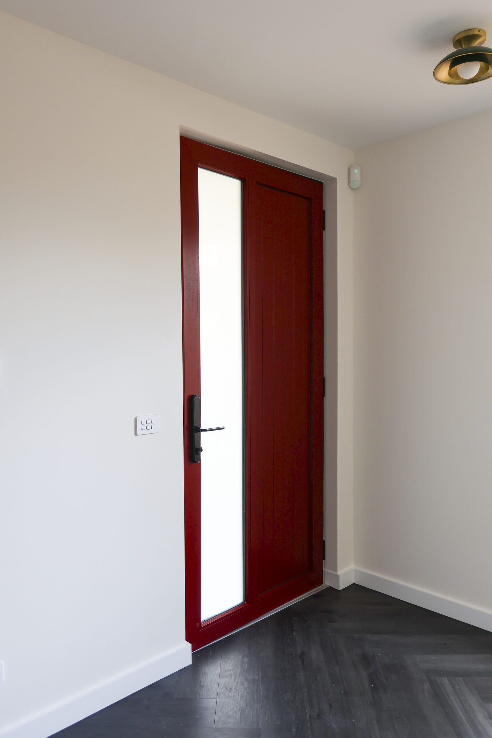The Entry has custom design with black door jamb and red sash, features the Alumat Magnetic Threshold that allow accessibility and zero stepover.